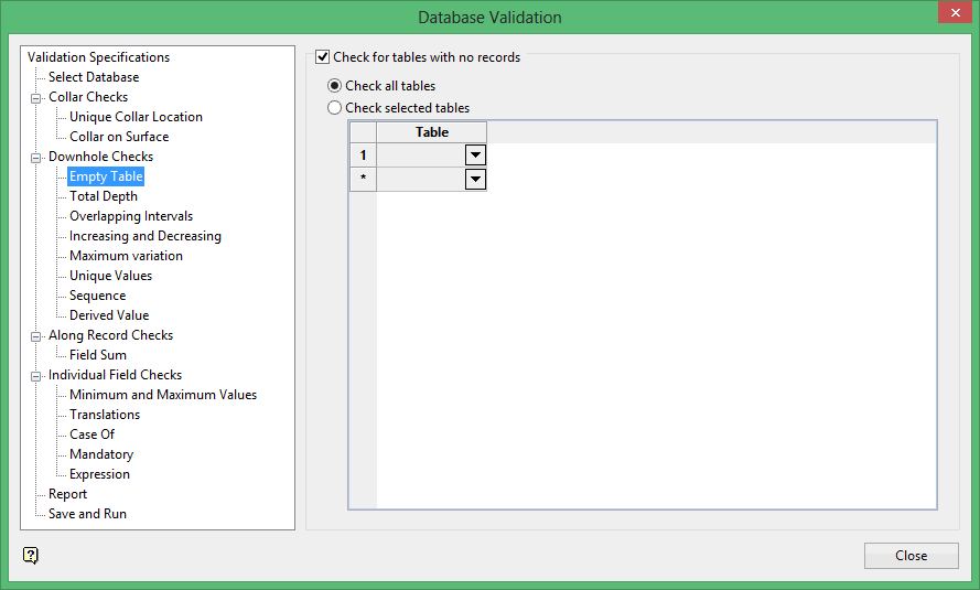 These options return errors when fields no not represent a defined sequence when evaluated from the drillhole collar to the last logged interval. These fields may be alphanumeric or numeric.