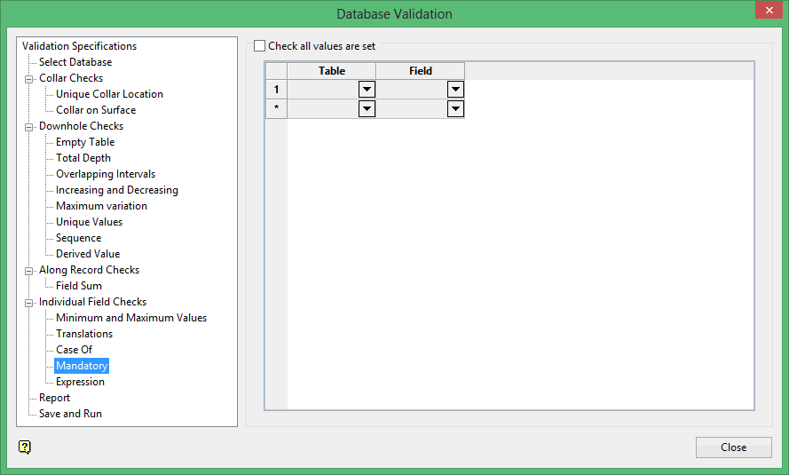 This test ensures that all specified Field(s) are not blank. This ensures that each interval in the drillhole is logged.