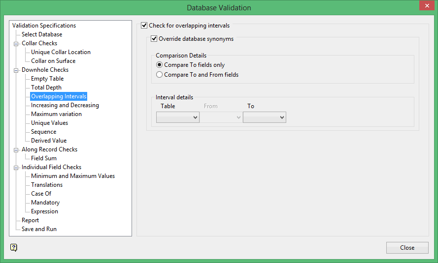Select this check box to specify whether to compare only the 'To' or both the 'To' and 'From' fields, and also which database table and fields (columns) to use in the overlapping intervals check.