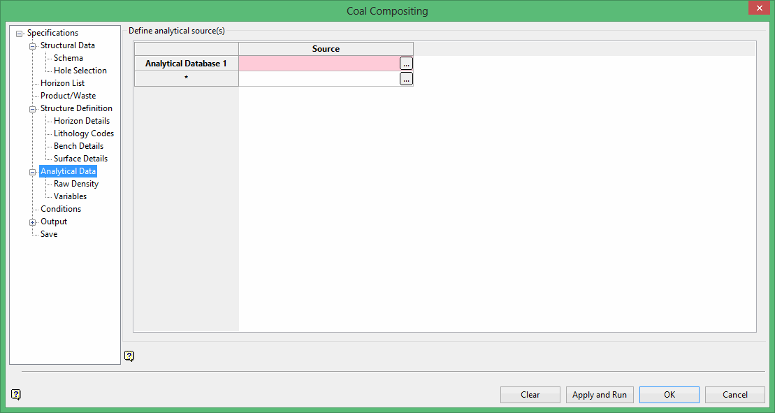 Use Analytical Data to define any analytical sources that you will be using, for example any database that contains a field that you want to composite. If you have a separate database that contains the raw density, and density is needed for the composites, then the database must be defined in this section of the panel. If your analytical data is in the same database as the structural data, you will also need to specify it here.