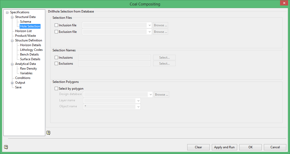 Drillholes can either be limited by name or by position. If none of the options in this section are selected, then all available drillholes will be used. Entries in the nominated drillhole selection files (.sel), as well as the drop-down lists, may contain wildcards (both * multiple and ? single character).