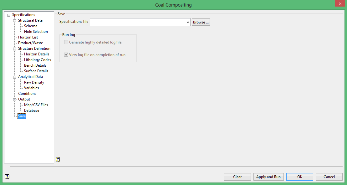 The Coal Compositing specification file saves with a <.ccp > extension. Click Browse to save the specification file to a location outside the current work area.
