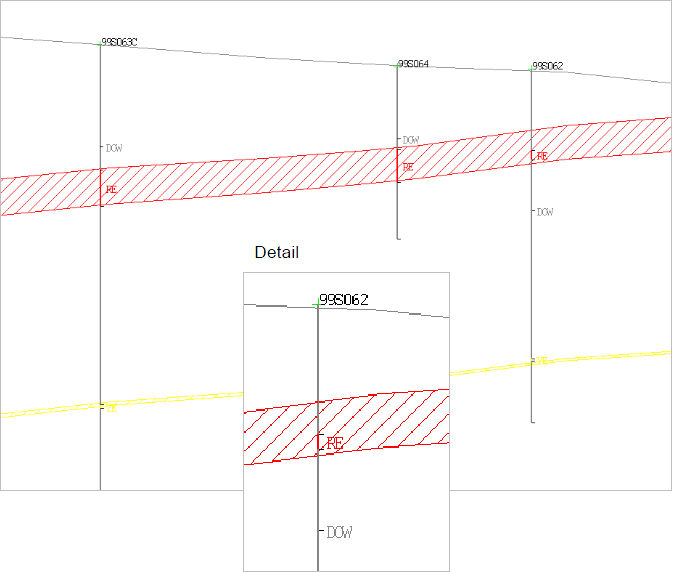 When DOW is used, the RE horizon in hole 99S062 is interpolated to a full thickness as defined by the surrounding intercepts. This is because the logged roof and floor positions of RE in hole 99S062 both fall above DOW. This horizon can be subsequently cropped back to a weathering surface, such as topography, if required.