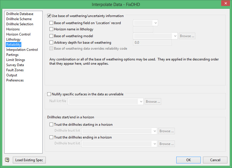 If Base of weathering data overrides reliability code is not checked in the Base of Weathering/Uncertainty subpanel, the reliability code selected in the Drillhole Scheme subpanel will take precedence over the DOW data reliability position.