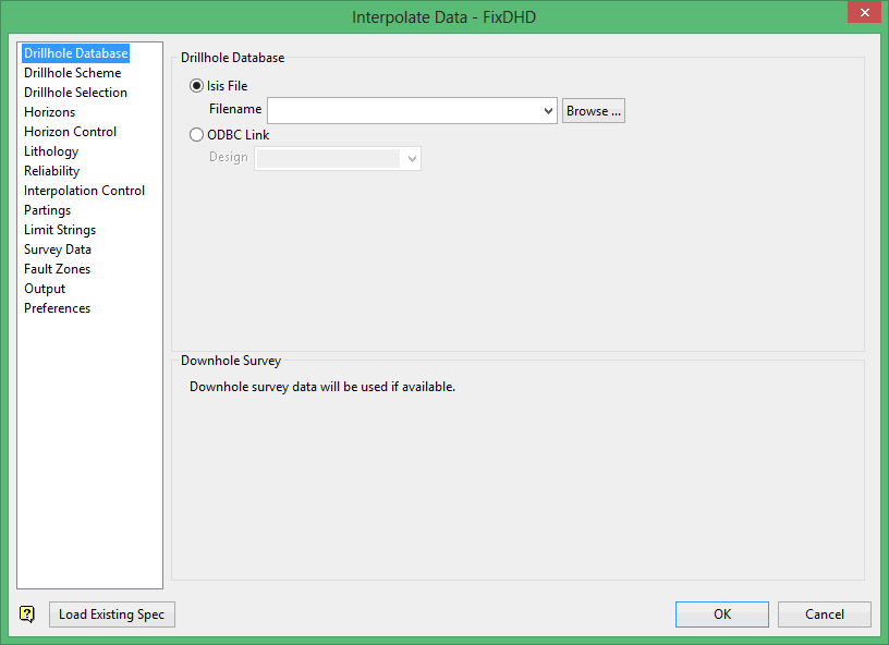 Select the drillhole database which contains the data necessary for creating the grid model. If the database exists in the current working directory, select the database from the drop-down list. Alternately, click Browse to select a database from another folder, including one that is located on a network. Select ODBC Link to access a third-party database such as Microsoft Access or ORACLE.