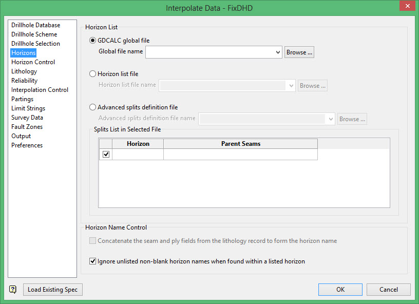 Use this to sequence the missing horizons in a drillhole and to keep the splitting relationships consistent, FixDHD requires a horizon list. This may be provided in three ways.