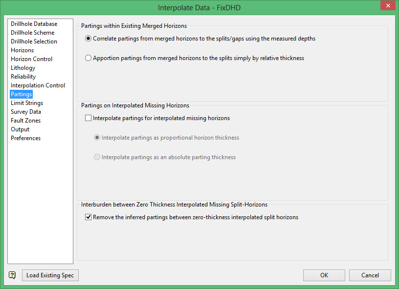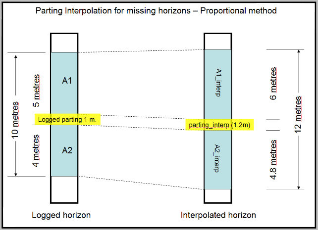 By default, missing horizons which are interpolated at a drillhole do not include partings. Check Interpolate partings for interpolated missing horizons to interpolate parting thicknesses when a missing horizon’s thickness is interpolated.