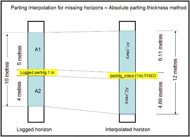 When using the Interpolate partings as an absolute parting thickness option, it is possible for the parting thickness to be calculated as greater than the horizon thickness. If this occurs, the parting thickness is reduced to the horizon thickness.