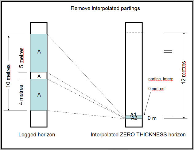 Child horizons which have been interpolated with zero thickness may merge with horizons in surrounding holes that may have a logged thickness. If the child horizons with logged thicknesses do not express interburden, there may be a false thickening of interburden due to the interpolated position of zero-thickness child horizons.