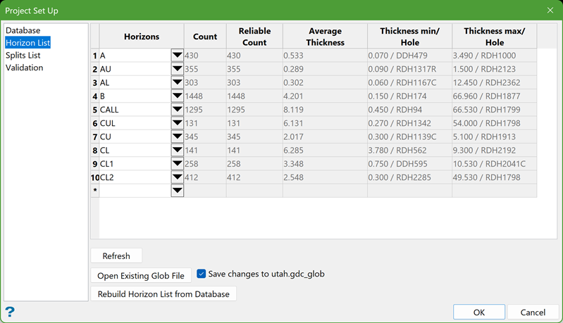 This section provides options to select the drillhole database, create and edit horizon lists, define splitting relationships, and check the validity of the drillholes. There are mainly four options: