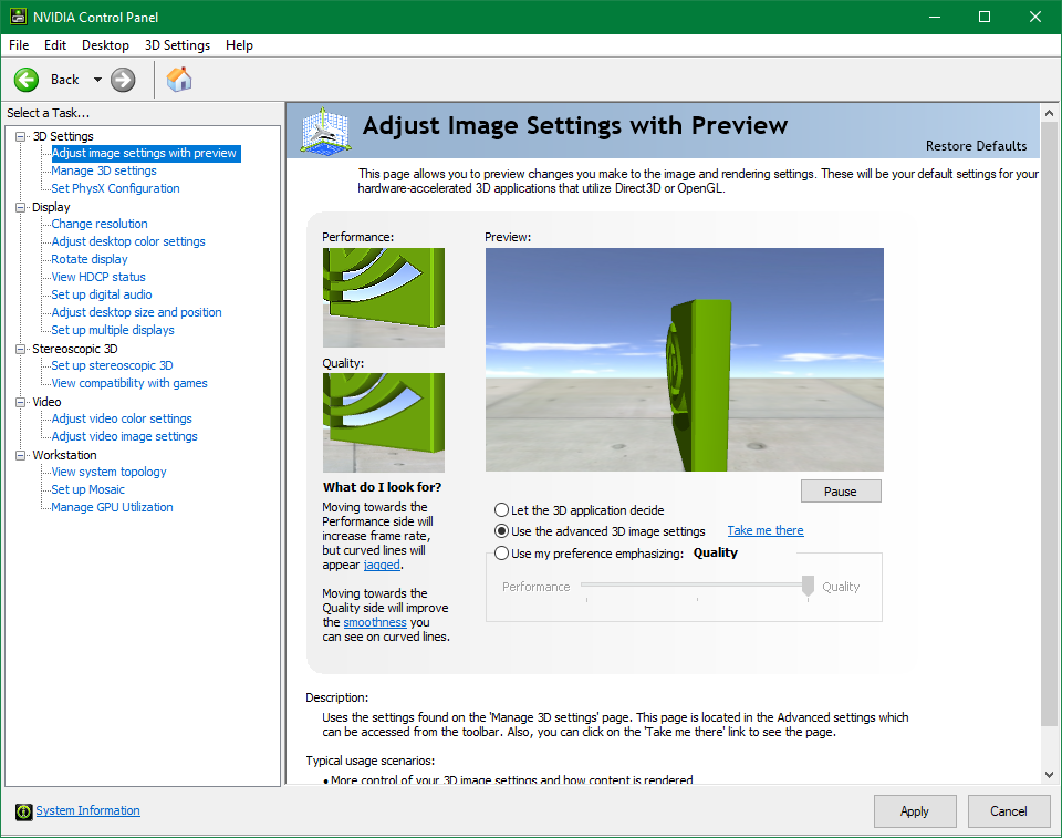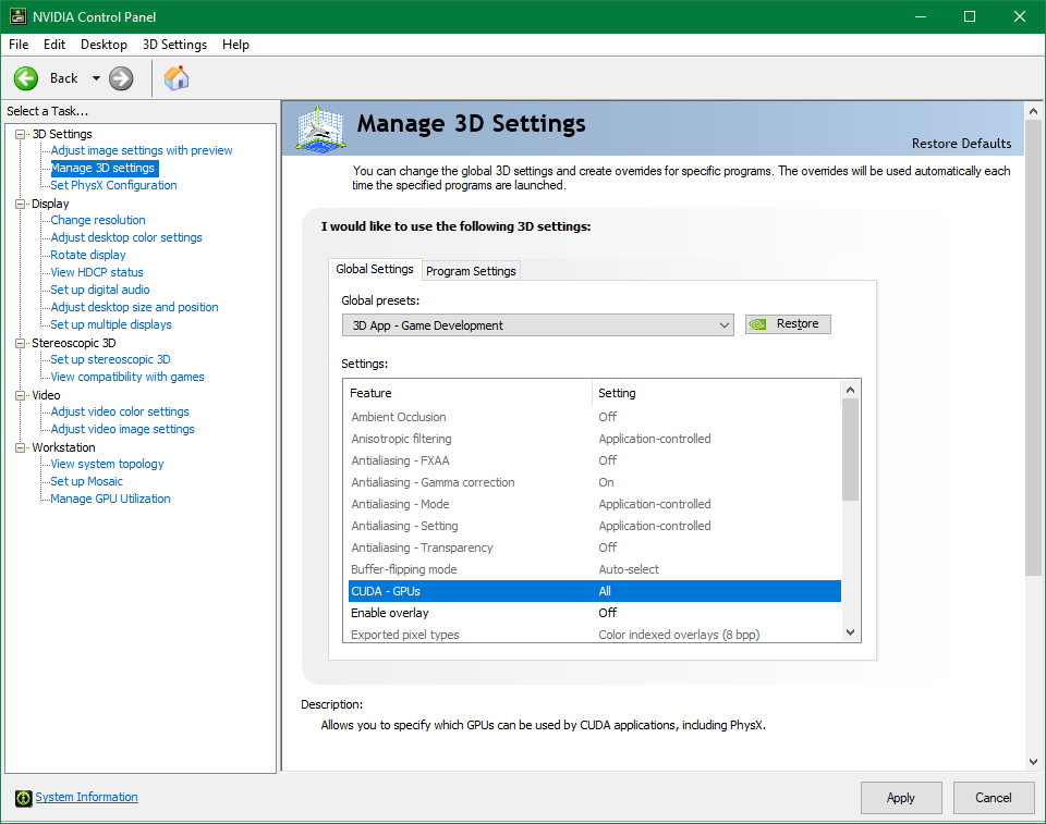 Note: Quadro "Global Presets 3D App - Game Development" regularly becomes disabled/reset to the default "Base Profile" as a result of a Windows Update, a driver update or sometimes on installation of another software package. You may need to check and re-establish the "3D App - Game Development" setting.