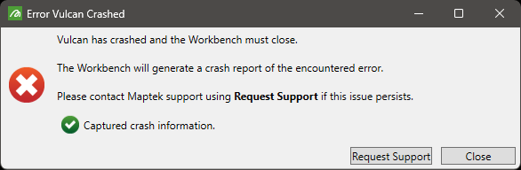 Crash reports are generated automatically by Vulcan when the software is artificially terminated (i.e. the software is abruptly closed without saving or using the correct shutdown procedure). Such abrupt terminations may be caused by issues such as exceeding memory limitations, network connection issues, or software defects.