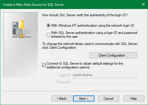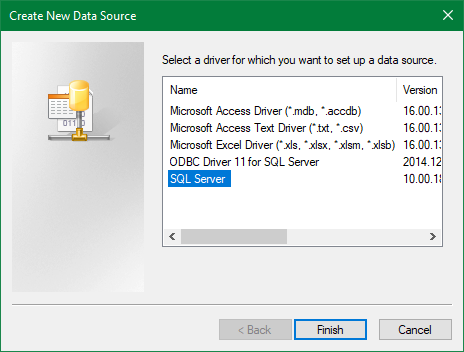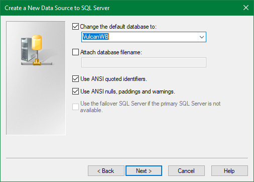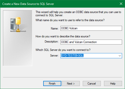 ODBC-Vulcanhere), some description (optional) and, then the SQL Server name that you want to connect to and click Next.