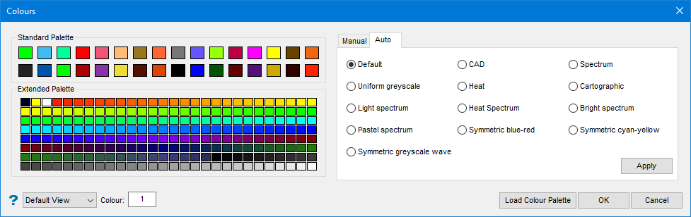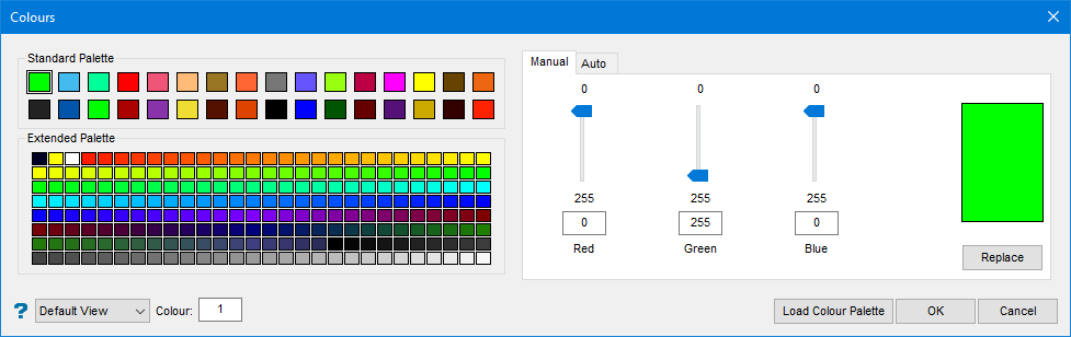 The Manual and Auto methods may be combined as long as the total number of colours does not exceed 32 for the standard colour palette or 256 if you are using the extended colour palette.
