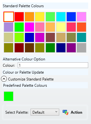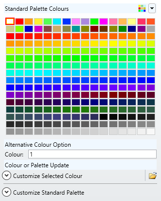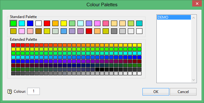Vulcan is delivered with two preset colour tables (palettes). The standard colour table contains 32 colours, and the extended colour table contains 256 colours.