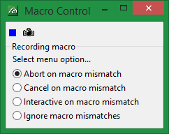 This toolbar displays when you select the Macro Create option. It allows you to select your method of reconciling macro mismatches, which is when events were recorded in a different order than the system will expect when the macro is being replayed or when the state of the system has changed. For example, when you create points for the first time you need to allocate a layer, however, this is not necessary for subsequent point creations. Thus a macro mismatch is created.
