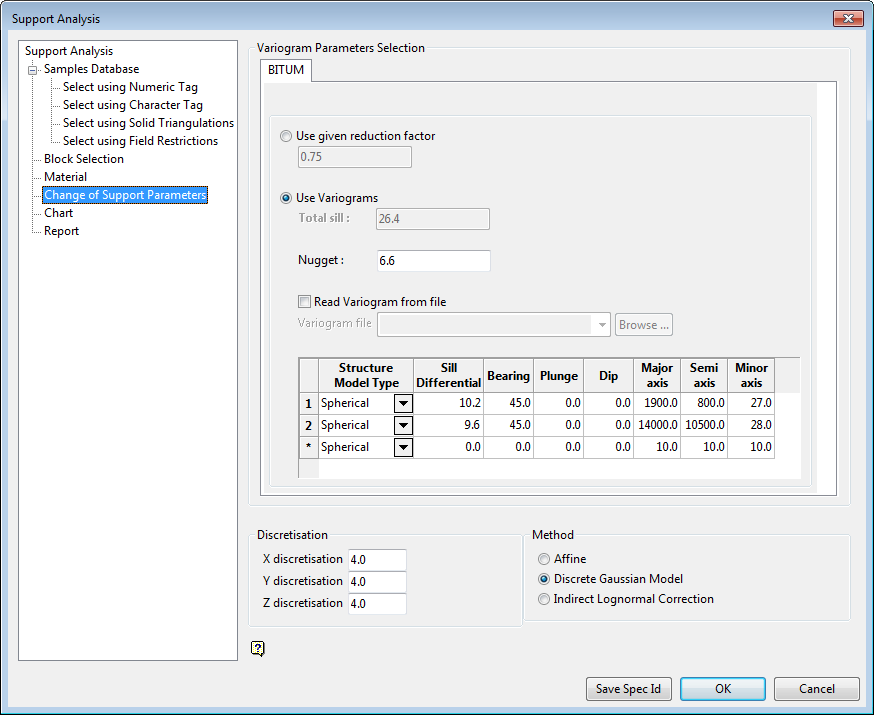The Support Analysis tool allows you to model grade distribution from samples databases as if they were used to create resource block models at a given block size. The tool can use Affine, Indirect Lognormal correction, and Discrete Gaussian Model as the support change engines.