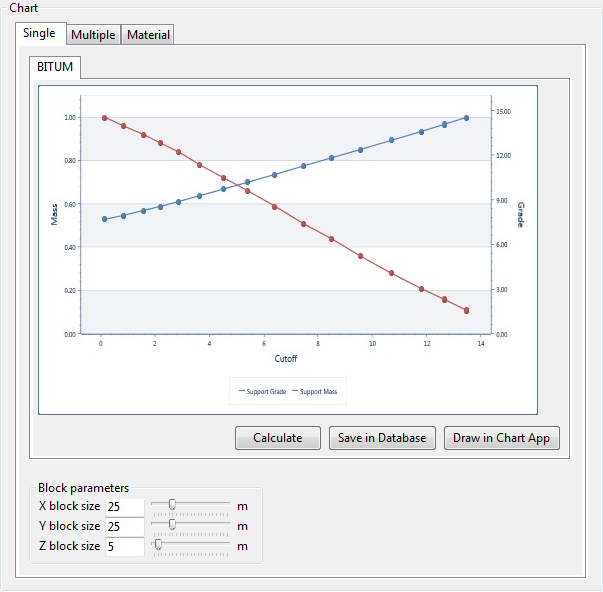 The analysis is performed using multiple variables and can use multiple cut-offs. An option to define materials using conditions lets you determine classification volumes based on adjusted grade distributions across multiple variables.