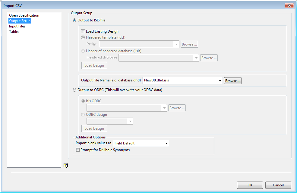 You can also assign drillhole synonyms during import by selecting the Prompt for Drillhole Synonyms check box on the Output Setup branch of the Import CSV panel. If you want to assign synonyms at a later time, you can open the database design in the Isis editor and assign the synonyms as required.