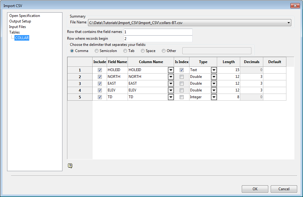 - Click on collars-BT.csv in the file list first as this will be the column used to identify the primary key.