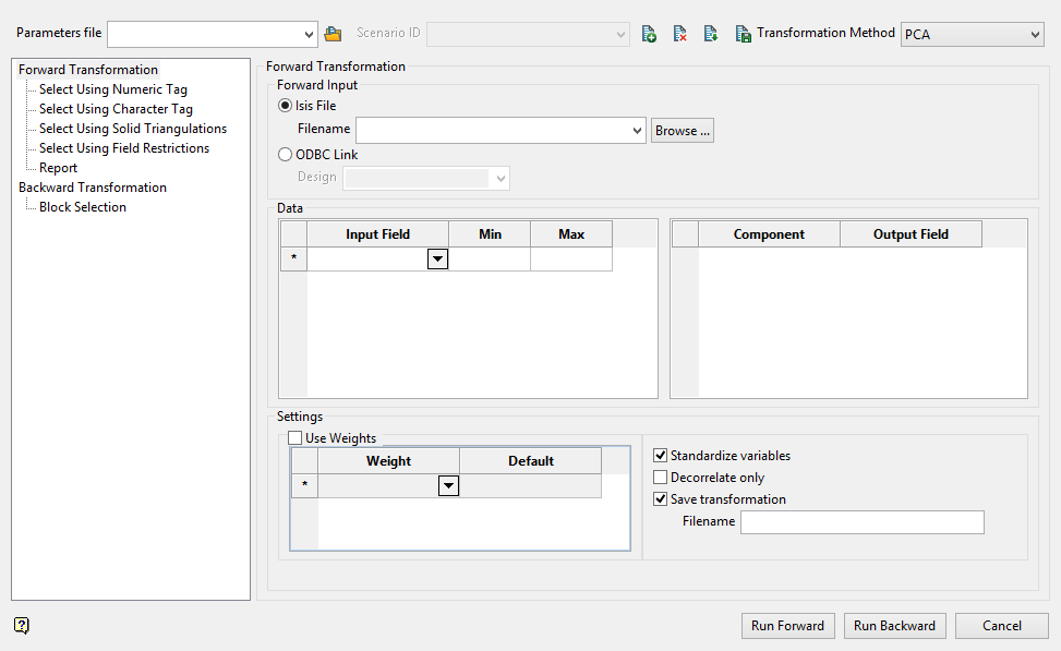 This section is split in half vertically. On the left; specify the original input fields, of which there could be many. On the right; specify the fields for the output components. There are two grids for two reasons: Â First, to avoid associating an input variable with a particular component. We are going to transform Ni, Fe, MgO, and SiO2 into PC1, PC2, PC3, and PC4. But it is not as if Ni becomes PC1, Fe becomes PC2, and so on. Secondly, there could be many input variables and relatively few principal components. Having a second grid allows that use case.