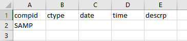 Create a new CSV file and enter the following headings in the top row: compid, ctype, date, time, descrp.  Under the heading ‘compid’, enter the primary key name SAMP.