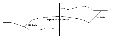 The batters are the sloping sides of the cross section that come about when the road section cuts into the terrain, or when the road is above the terrain and fill is needed. In the Iroad module, the batters can be specified as either normal or catch line type.