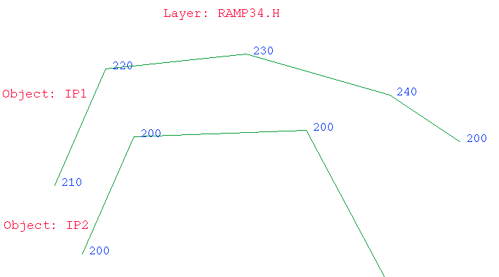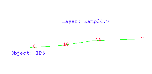Each set of intersection points are one object with the name IP<n> where n is an increasing integer. The W tag of each point holds the vertical curve length (parabola). The objects are placed in a layer named <design_name>.V. See Diagram 4 for a graphical explanation.