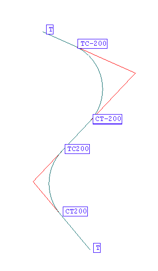 Points that are on a straight line are named T (Tangent). Points that are not on a straight line are named a combination of where two curves meet. For example, TS (Tangent to Spiral), SC (Spiral to Circular Curve), CS (Circular Curve to Spiral), ST (Spiral to Tangent). These points are also given a number. This number is the radius of the curve (for example TC200). A positive radius indicates the alignment is curving right, a negative radius indicates the alignment is curved left. Use the Analyse > Label > Point Label option to view the names. See Diagram 1 for an example.