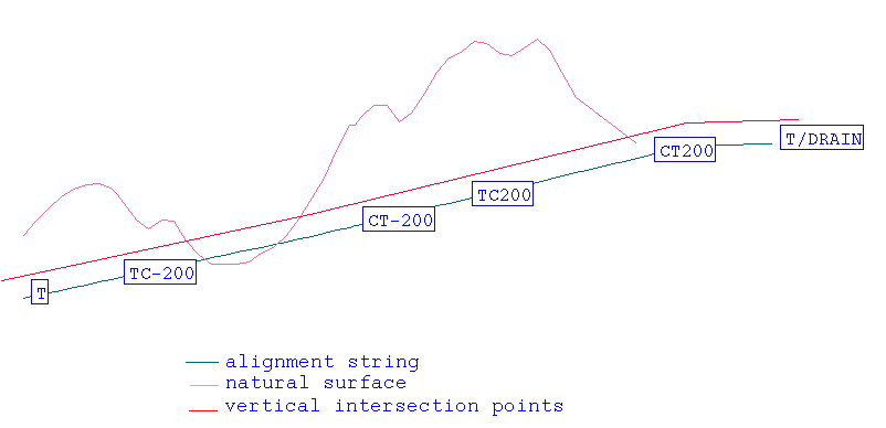 Use the Mark option to label alignment points. This option is useful for locating points in long section. If you know the location of some feature in plan, then you can label the alignment with a meaningful name, so that when you look at the alignment in long section, you can see where the feature lies. The label is appended to the point name, for example T/DRAIN where T = point name,/ (forward slash) = separator and DRAIN = label.Instructions