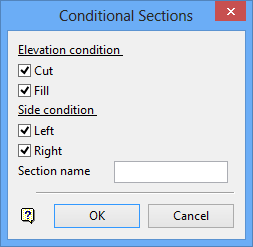 Select the appropriate check boxes to apply the section to cut and/or fill conditions. In this way a different section can be applied in the case of cut or fill, or the same section can be used in all cases. The cut or fill condition depends on whether the road edge is respectively below or above the natural surface. You need to select at least one condition.
