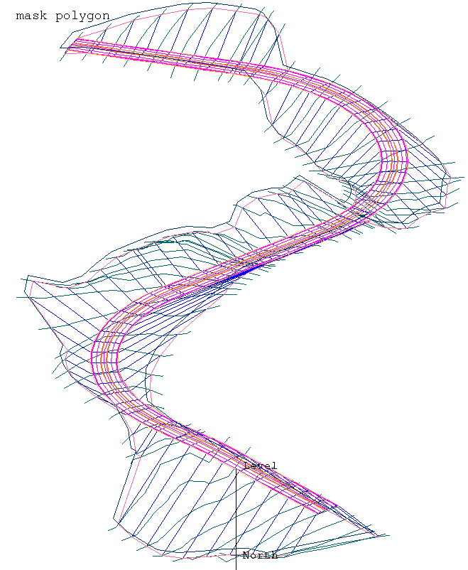 A mask is a polygon that totally includes all the created joining lines. The mask is useful when triangulating the road surface so that the triangulation does not extend beyond the roadway. It can also be used by the Design > Object Edit > Delete By Poly option to remove any topography points inside the roadway so that the natural surface can be modelled.