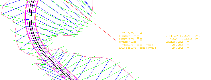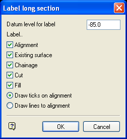 Use the Label option to label parts of the design objects with text suitable for plotting. Objects suitable for plotting are, in plan view, the horizontal intersection points and the horizontal alignment, and in long section view, the vertical alignment, natural surface, chainage and cut and fill volumes.Instructions