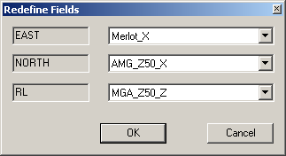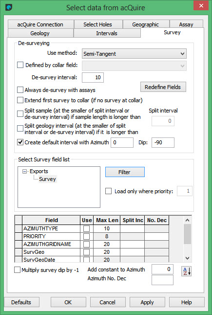 Select this button to redefine the source field for the data. By default the depth, dip and azimuth for a HoleID will be found in HoleSurvey, Depth, Dip and Azimuth. Select from the drop-down list of Survey fields if either or all of the depth, dip and azimuth are not defined in the default. Redefining the source field for azimuth could have an effect on the results if you transform the azimuth from one grid to another grid system.
