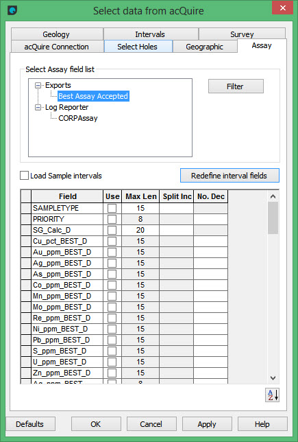 Select this check box to include sample intervals, for example, SampleID, SampFrom and SampTo. This is Only available if no Assay virtual fields have been selected.