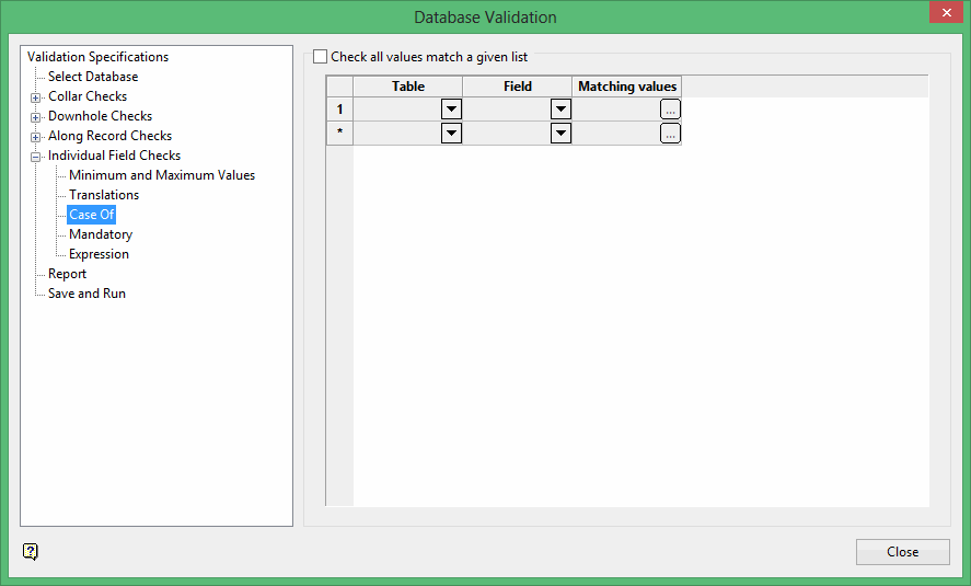 Select this check box to check that all values in the selected tables and fields match a list of defined values.