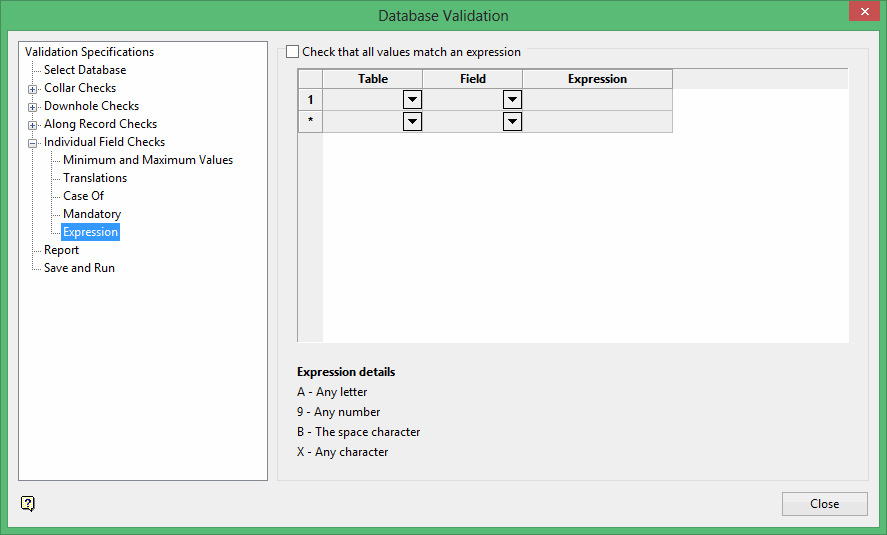 Select the table and field to check from the drop-down lists. Enter the expression that the field must match. The expression can be a letter, number, space or character, but must be entered according to the expression details key on the panel.