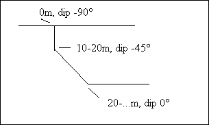 In the Segment Following option, the azimuth and dip describes the drillhole interval following the given depths. In the example, the azimuth of 120° and dip of -90° apply to the interval from the 0 metres through to 10 metres depth.