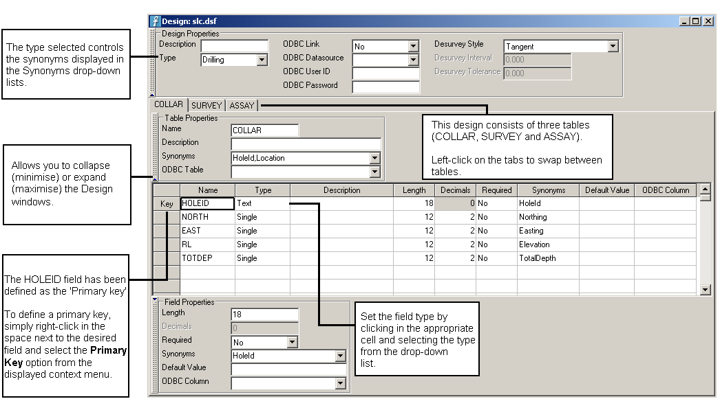 A design is divided into tables, each table is designed to cater for a particular type of information. For example, a COLLAR table may hold all the information relating to drillhole collar location and length, whereas the ASSAY table may hold all the information relating to the drillhole assayed samples. The table must be unique in the design. The first table is assumed to be the header table.