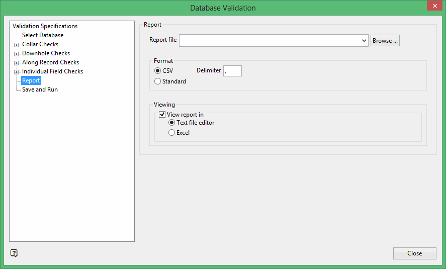 Use this section to specify how the report file is to be viewed once it has been generated. The report file can be viewed through a text editor or through Microsoft Excel.