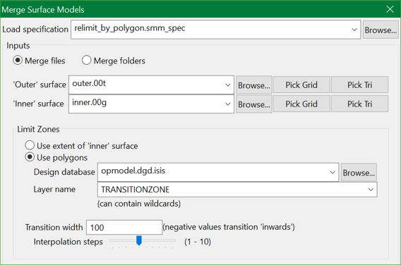Inputs are the surface models (grids or triangulations) that are to be merged. You can choose to merge two files or two folders containing multiple surfaces.