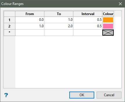 This method allows you, once this panel is completed, to enter manually a series of intervals and select a colour for each interval. The Colour Range panel, in which you enter the intervals, is displayed once this panel is completed.