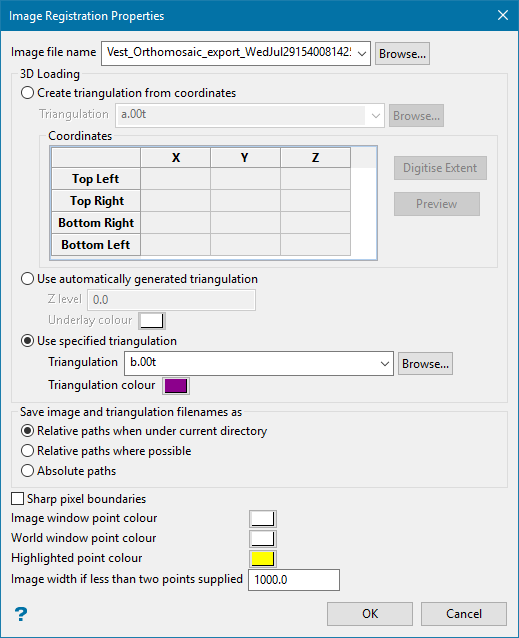 The ER Mapper ECW image format allows a very large texture to be applied to triangulations. For example, over 1 billion pixels may be interactively viewed using this option. Refer to the ER Mapper website for more information on producing ECW images.