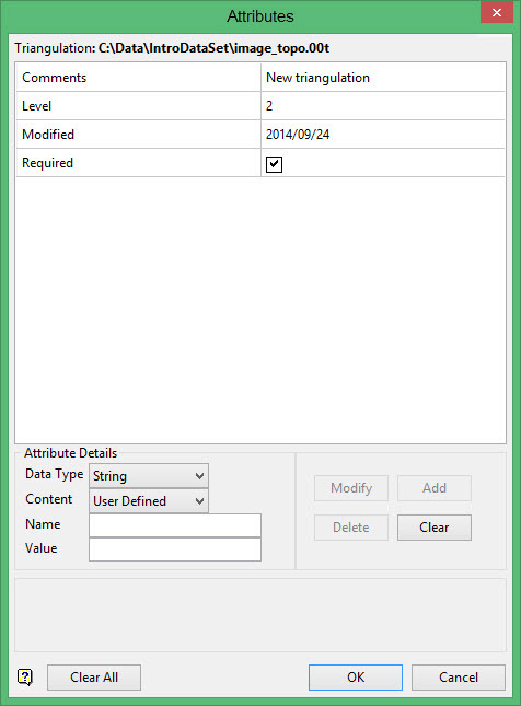 Use the Attributes option to view, add, modify, and delete attributes of triangulations. Each attribute includes a data type, name, and value. Data types include Boolean, double, integer, string, and date.