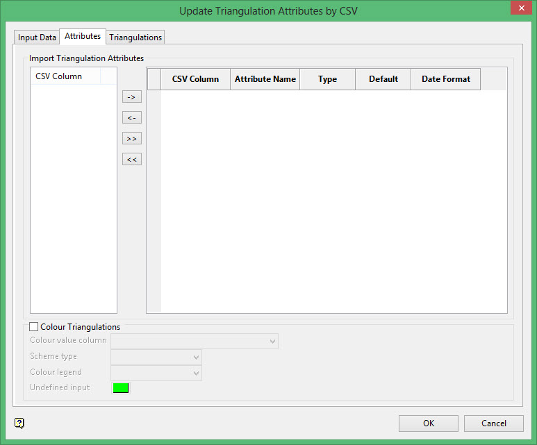 Select the attributes to import in the Import Triangulation Attributes section by highlighting the column name in the CSV Column section on the left side of the panel and clicking the arrow buttons to add the columns to the list on the right side of the panel.