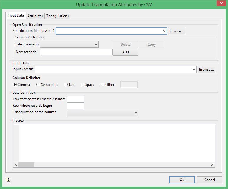 Use the CSV Import Attributes option to update the attributes of multiple triangulations based on the content of an external CSV or text file.