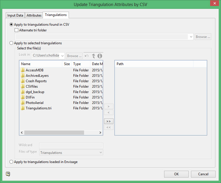 - Select Apply to triangulations found in CSV option to apply the changes only to triangulation names that are listed in the CSV folder and that are in your current working directory. To select a different directory, select the Alternate tri folder check box and select a directory name from the drop-down list or click Browse to select a different folder.