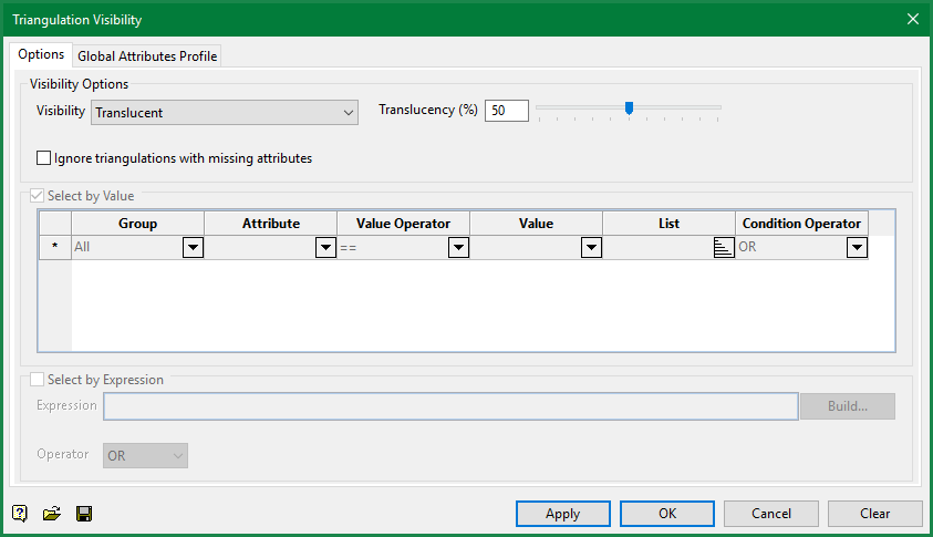 The Select by Value conditions can be combined with an expression provided by the Expression Builder control or manually entered at the Expression edit box. The combined expression creates the triangulation visibility criteria that is applied to the loaded triangulations.