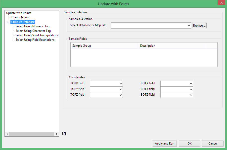 The Update with Points option allows you to adjust the vertex of triangulations using digitised or existing points. Â Existing points may be imported from a layer or database.