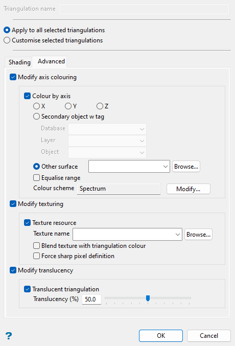 Customise selected triangulations: Select this option to apply display properties to each selected triangulation separately. Once this option is selected, the panel is updated with the name and properties of the first selected triangulation. Change any of the properties and click OK. The panel is then displayed again with the second selected triangulation's name and properties. This process continues until all of the triangulations' properties have been displayed.